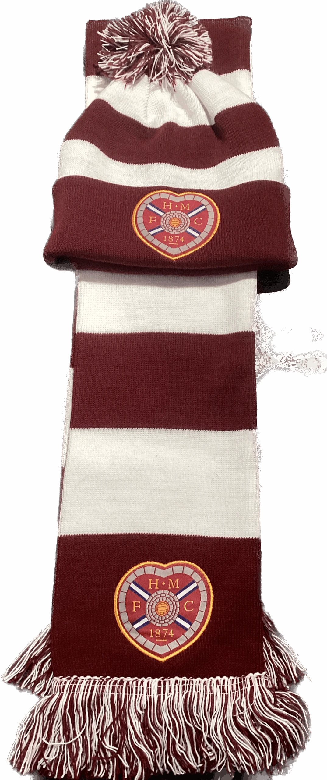 White and Maroon bar scarf with a crest at the end. White and maroon pom pom hat with a crest on the centre.
