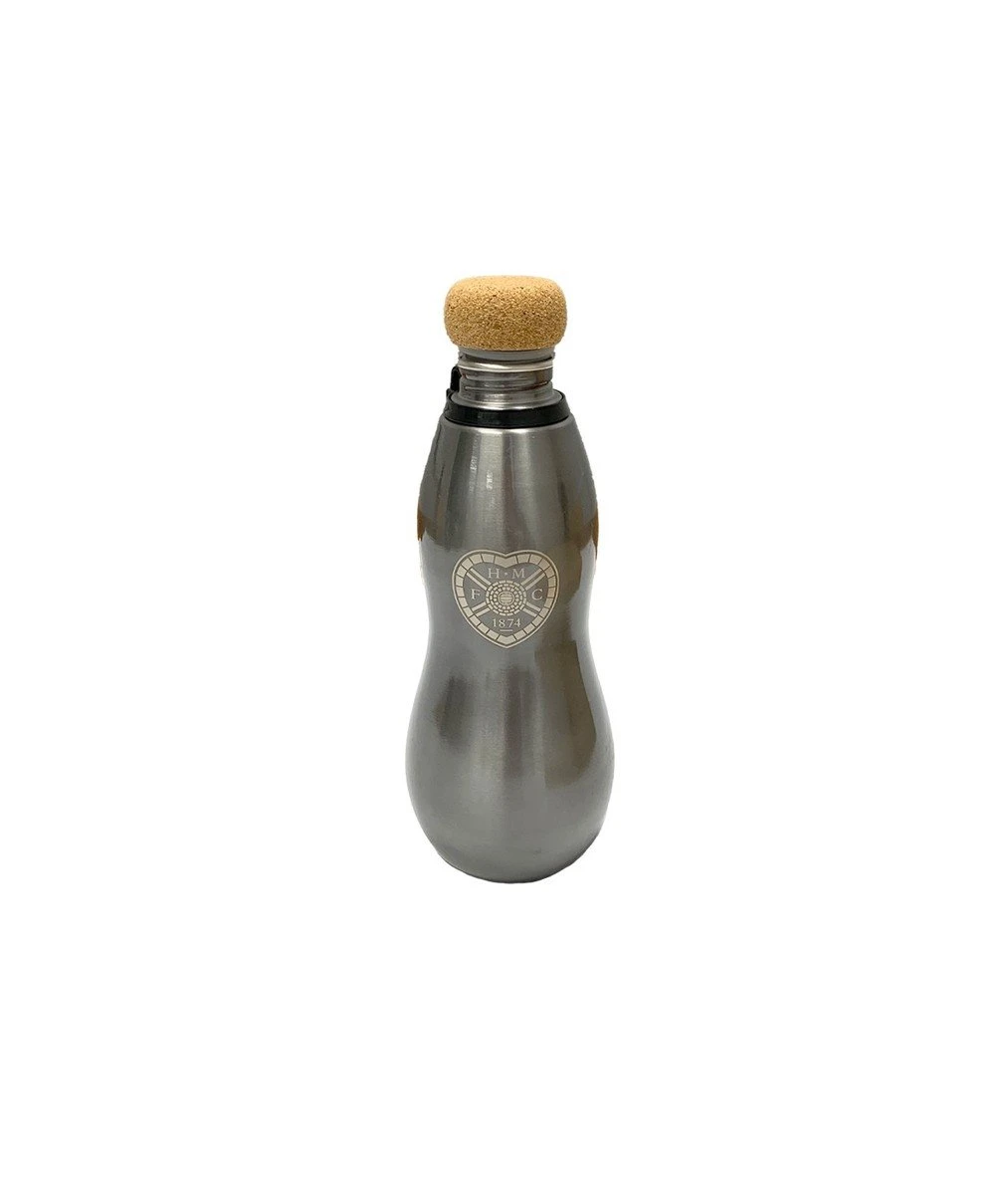 690ml single walled, stainless steel bottle with PP plastic and cork screw on lid. Hourglass curve design for easy grip with black plastic and silicone carry strap attachment,