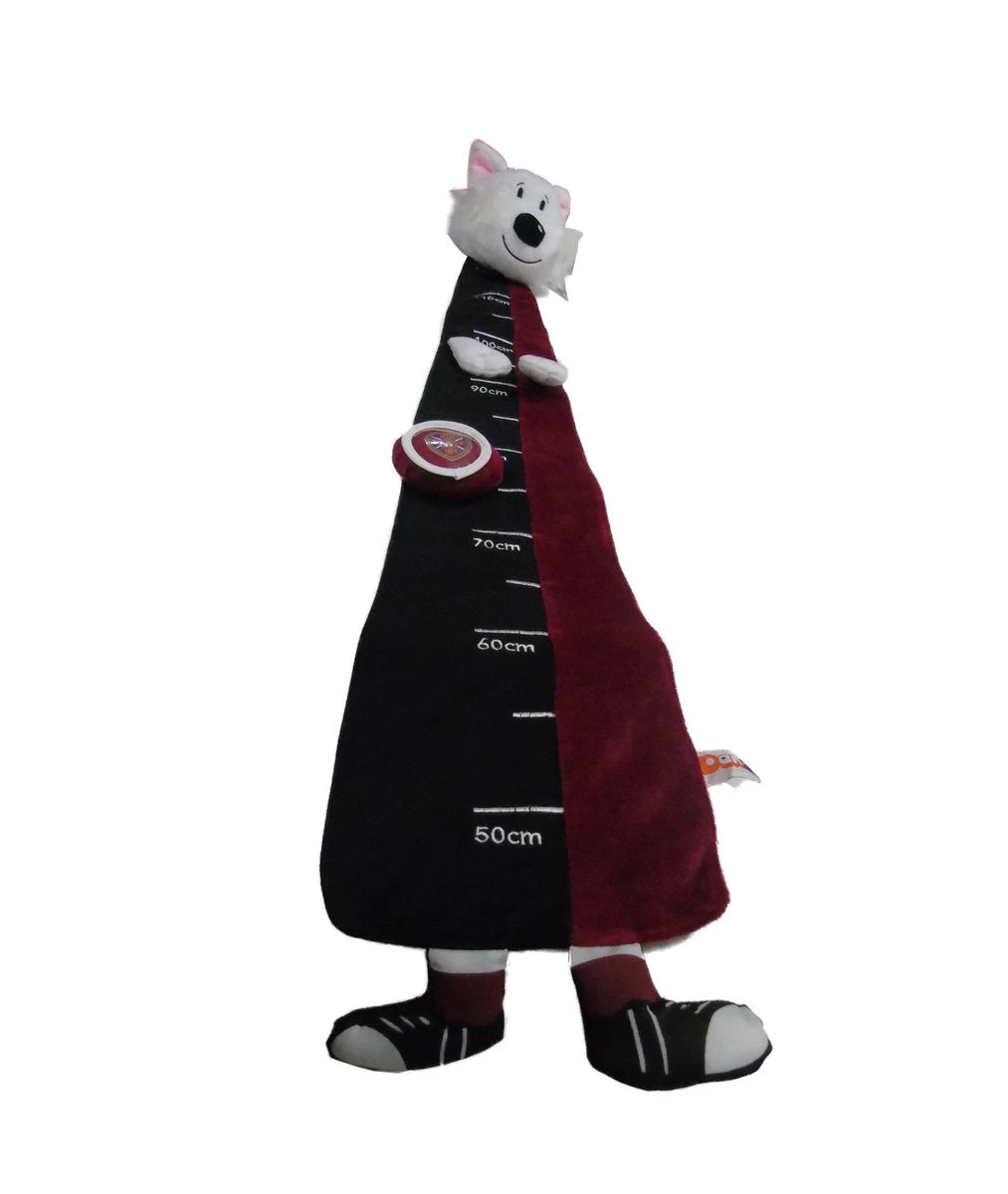 Jock the Jambo themed height chart for children, marked 50cm,60cm,70cm,80cm,90cm,100cm 110cm, and 120cm with a sucker to attach to the wall and a velcro Hearts Badge to mark the height.